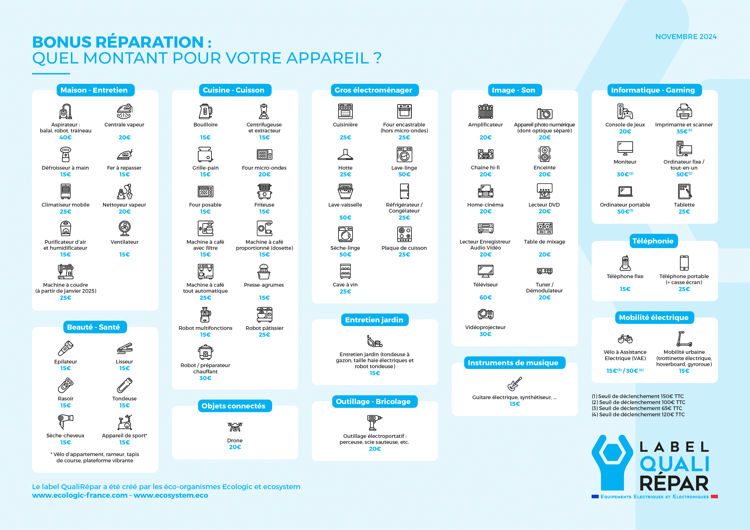 Ce bonus réparation vous permet de bénéficier d’une réduction sur le prix de la réparation de votre appareil électrique ou électronique en vous rendant chez un réparateur labellisé « QualiRépar ». L’objectif de ce bonus est de prolonger la durée de vie de ces appareils.