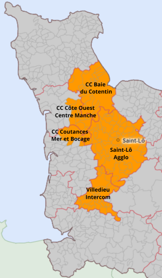 Saint-Lô Agglo, Villedieu Intercom et la CC Baie du Cotentin adhérent pour la totalité de leur territoire. La CC Coutances Mer et Bocage et la CC Côte Ouest Centre Manche ne sont adhérents que pour une fraction de leur territoire correspondant respectivement aux anciennes communautés de communes de St-Sauveur-Lendelin et Sèves Taute.